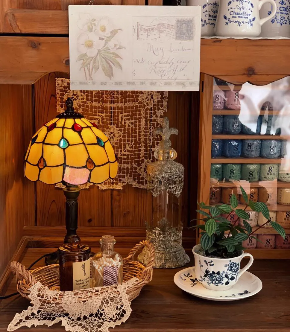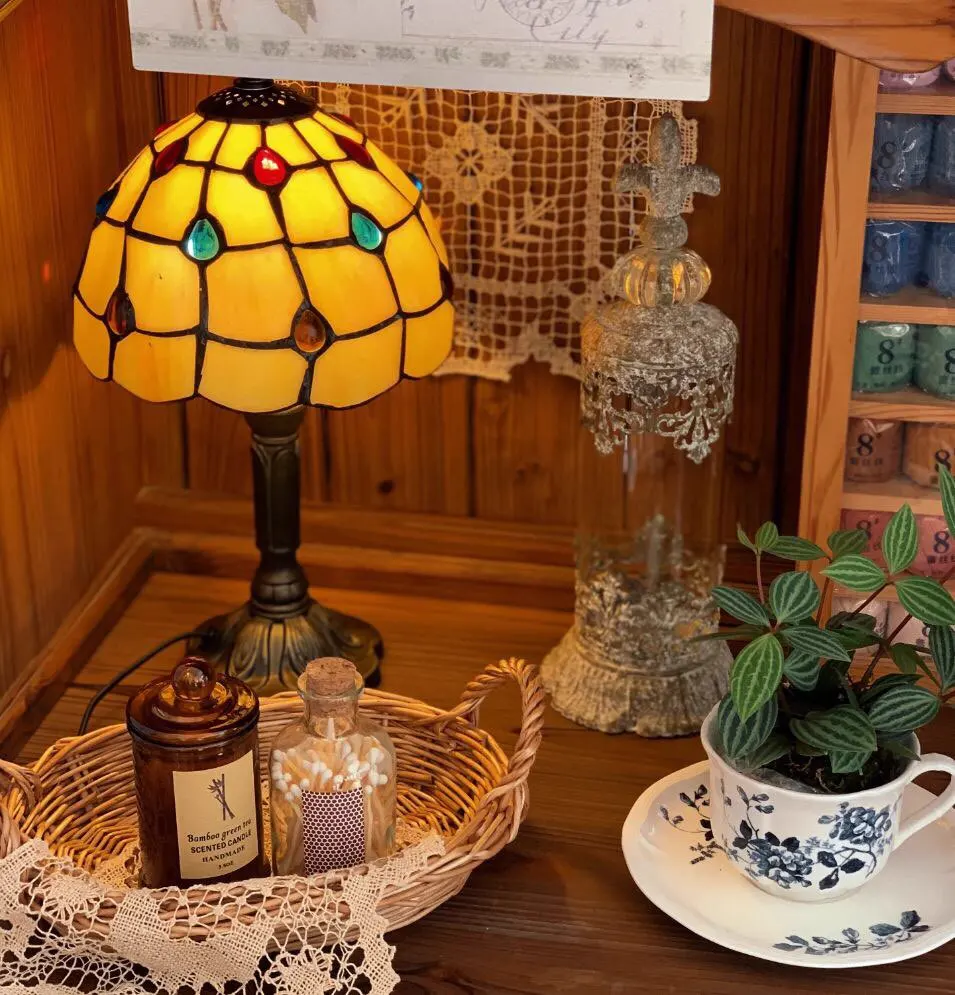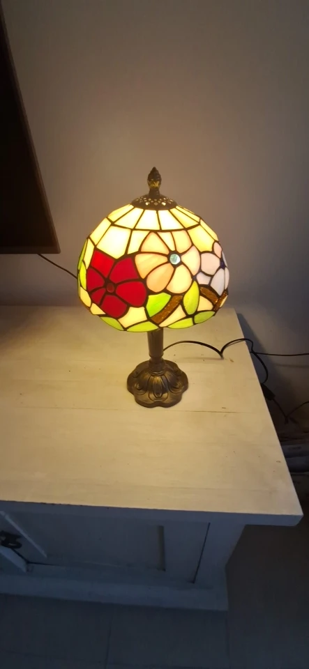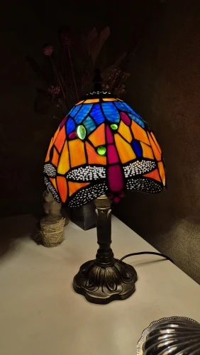 Material: Colored glazed mosaic glass shade, resin base, painted surface
